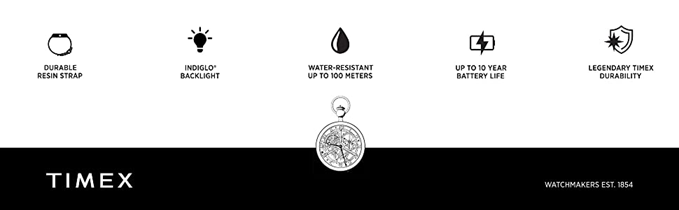 • Adjustable black 18mm resin strap with fits up to 8-inch wrist circumference