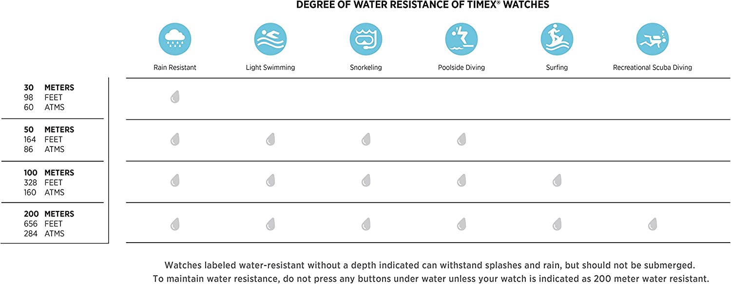 • Water-resistant to 100m (330 ft): In general, suitable for snorkeling, as well as swimming, but not diving