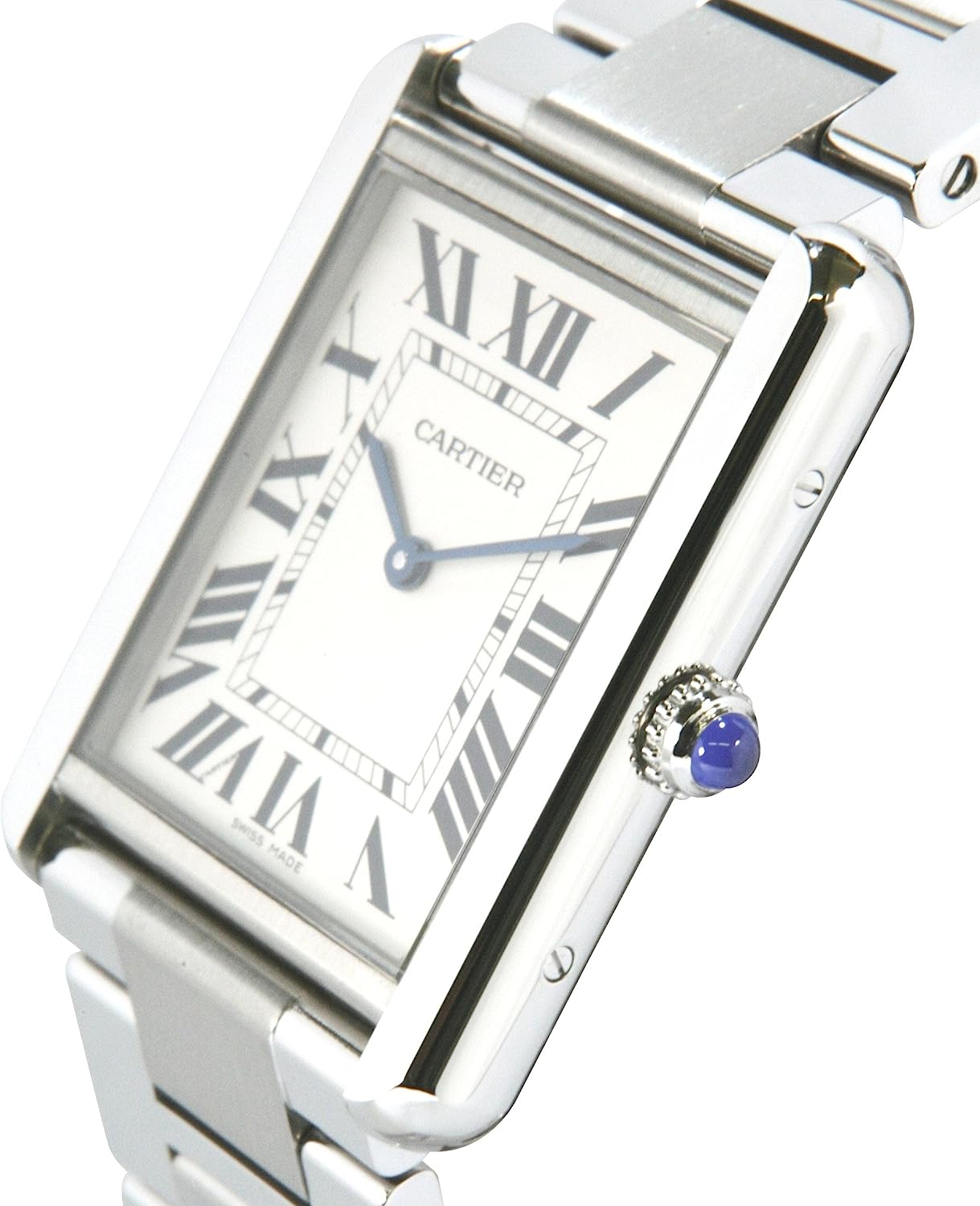 Square watch featuring logoed silver dial with sword-shaped blue hands and Roman numeral markers