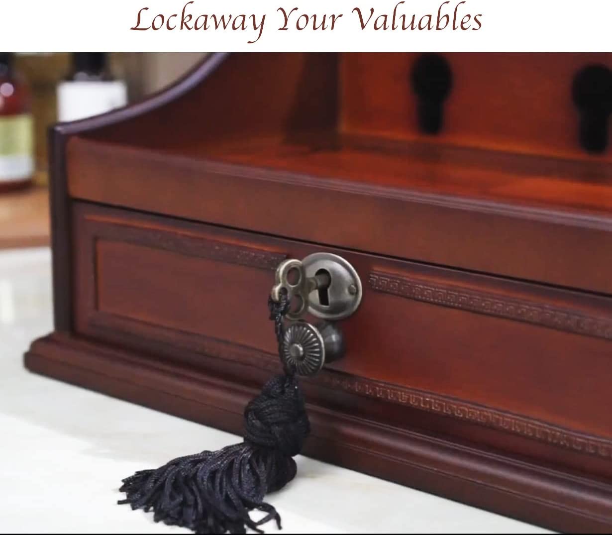 Upper Tray for Daily Essential Items, Additional pull-out drawer below with lock to protect your valuables and a back compartment for organizing charging cables.