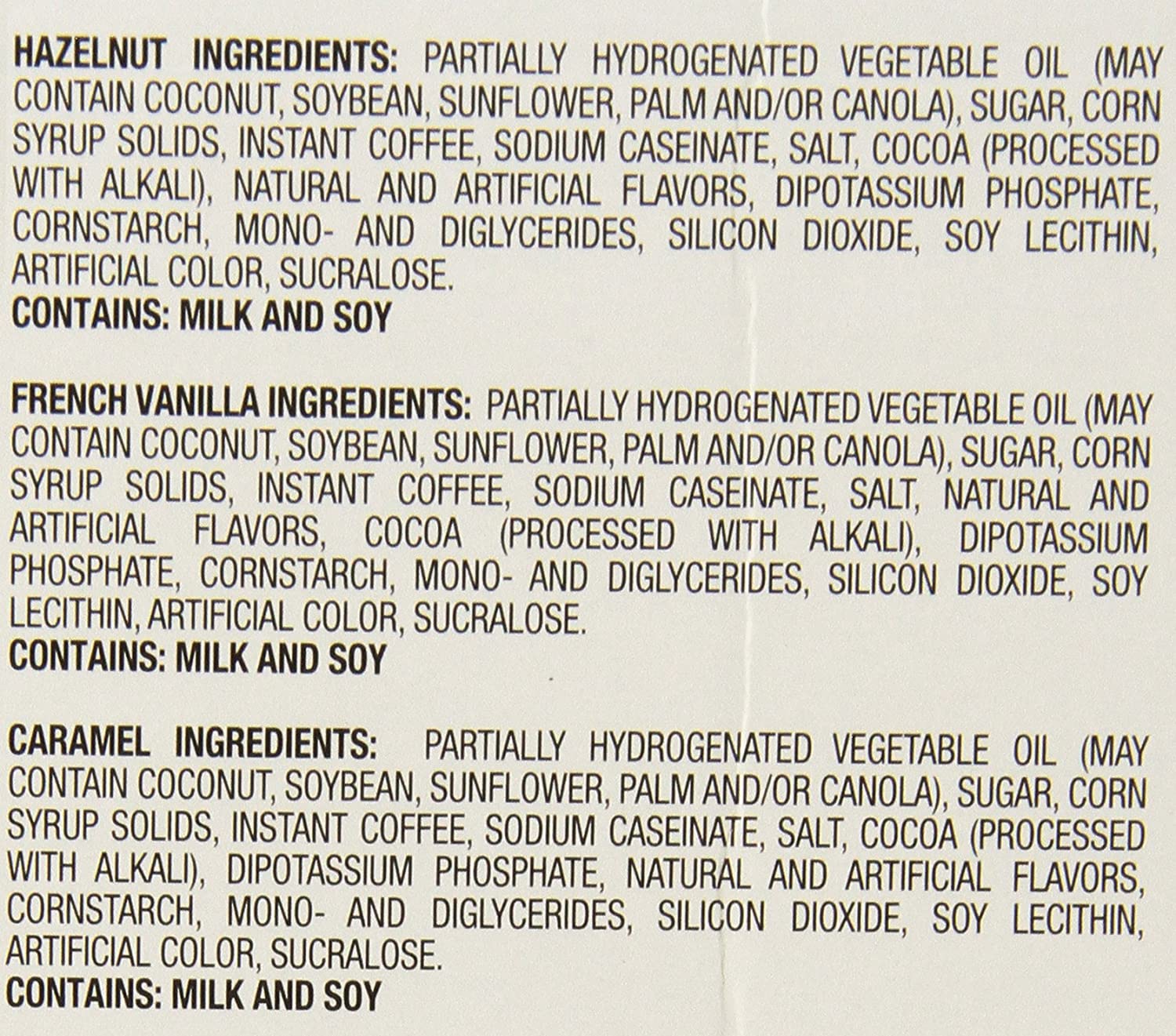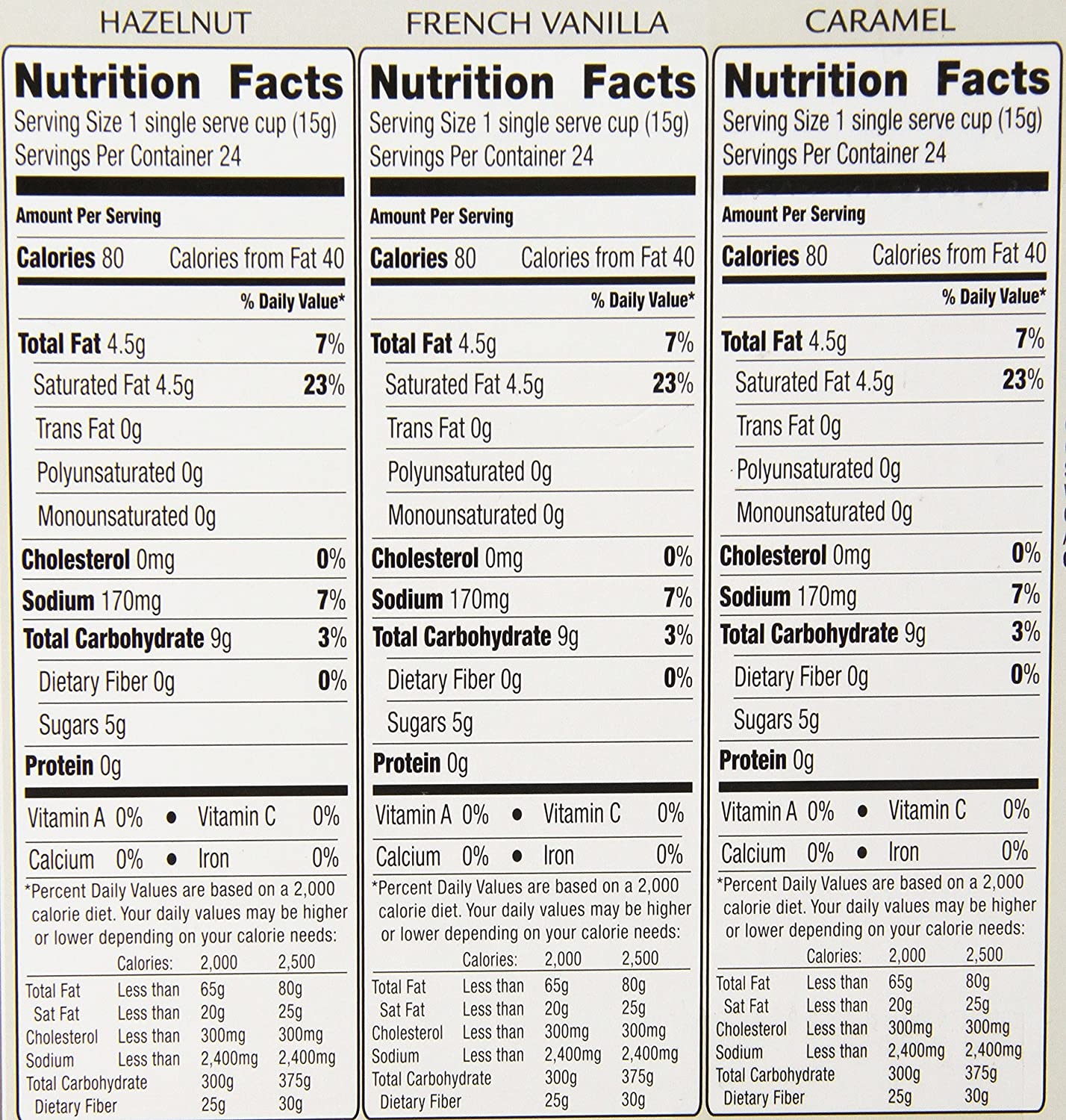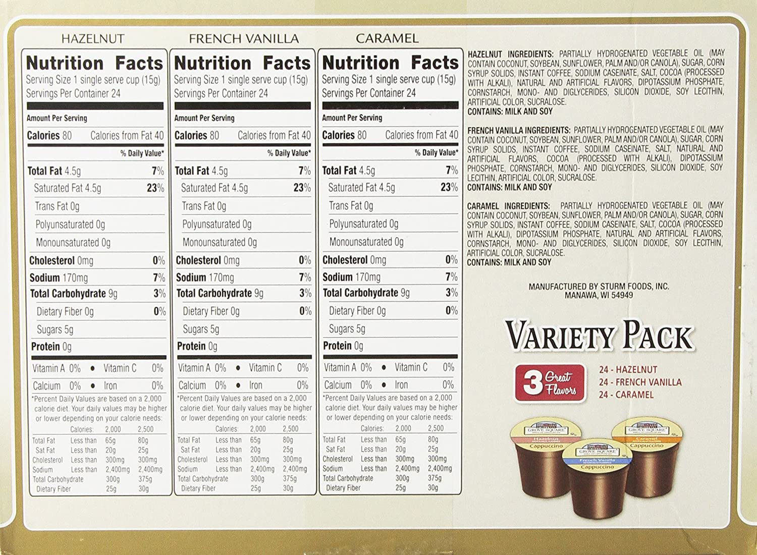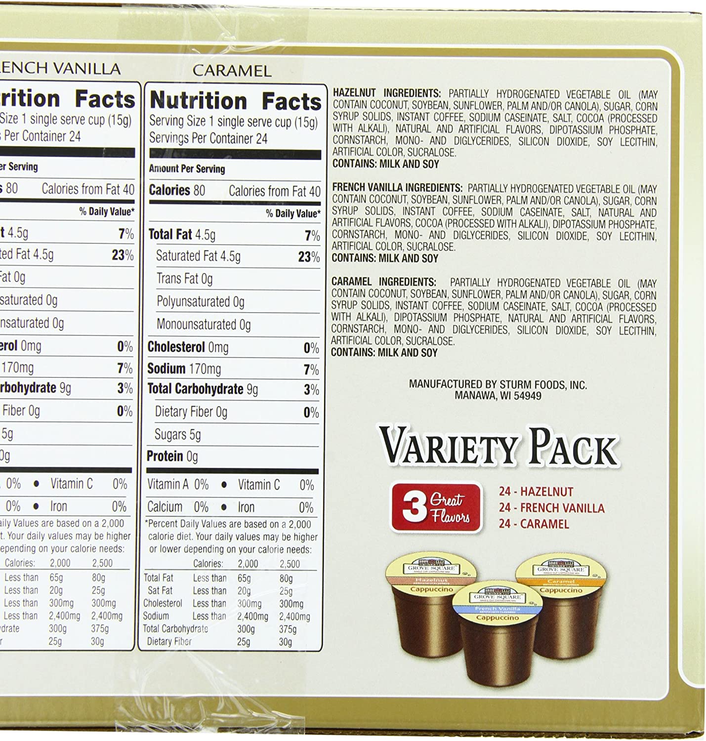 Contains 24 single serve cups each of Hazelnut, French Vanilla, and Caramel flavors