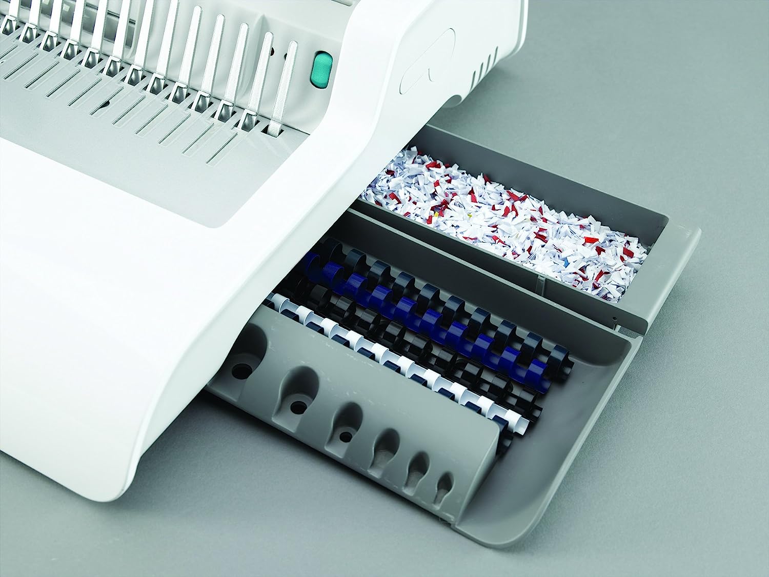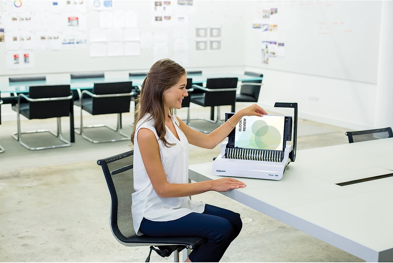 The full-featured, medium duty Fellowes Pulsar Plus Comb Binding Machine is ideal for general office use. Compact machine manually punches up to 18 sheets at a time and binds up to 300 sheets with a 1-1/2-Inch comb. Vertical document loading ensures accurate punch alignment. Efficient design allows user to punch and bind in a continuous manner. Features built-in comb storage tray with document measurement device for added convenience and quick set-up. Adjustable edge guide centers documents with ease. Includes binding starter pack (contents: 10 pk assorted kit).