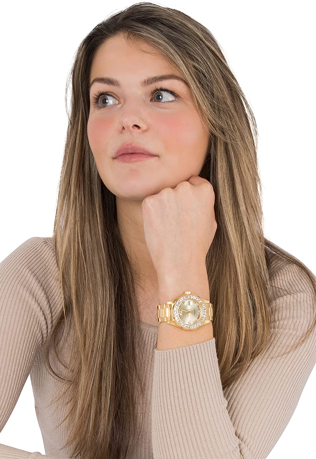 • Gold tone stainless steel case 38mm diameter x 12mm thick; Gold dial with 20 crystal accents; Luminous hands