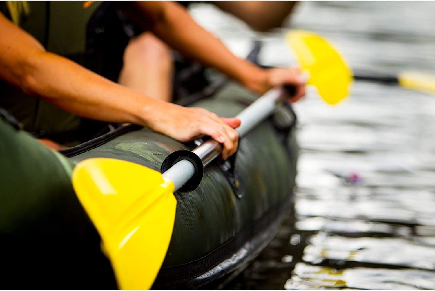 Take home your catch limit with a buddy after a day in the Sevylor Colorado 2-Person Fishing Kayak. With 18-gauge PVC, a thick tarpaulin bottom and a tough nylon cover, this kayak is durable enough to get you to your favorite out-of-the-way fishing hole. Just in case, though, the multiple air chambers will help you get back to shore. The adjustable seats will keep you paddling comfortably the whole trip. But if you want to move more easily, you can always add the Sevylor trolling motor and store your paddles in the convenient holders. The Berkley Quick Set Rod Holders let you adjust your pole angle for the ultimate hands-free fishing experience. With your hands free, it's easier to take care of your gear, which stores nicely in the mesh pockets or attached to D-rings.