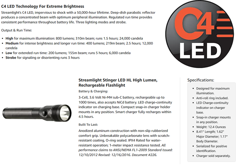 Streamlight 75429 Stinger LED HL Rechargeable High Lumen Flashlight without Charger. Streamlight's HL Series - now available in rechargeable systems. When you need maximum illumination with a wide beam to search a large area, the Stinger LED HL rechargeable, high lumen flashlight provides a blast of 640-lumen with 297-meter of beam distance. 3-Lighting modes and strobe: High for high-lumen and super-bright light; Medium for intense brightness and longer run time; Low for extended run times and when a less intense beam is ideal; Strobe for signaling or disorienting. C4 LED technology, shock-proof with a 50,000 hour lifetime. Deep-dish parabolic reflector produces a concentrated beam with optimum peripheral illumination. Optimized electronics provide regulated intensity throughout battery charge. NiMH battery rechargeable up to 1000 times; also accepts NiCd battery. Made up of 6000 series machined aircraft aluminum with non-slip rubberized comfort grip and anti-roll rubber ring. Unbreakable polycarbonate lens with scratch-resistant coating. IPX4 water resistant and 1-meter impact resistance tested. Serialized for positive identification. Length: 8.41-inch (21.36 cm) and weight: 12.4-ounce (352 g). Comes with a limited lifetime warranty.