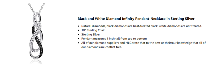 • Natural diamonds, black diamonds are heat-treated black, white diamonds are not treated.