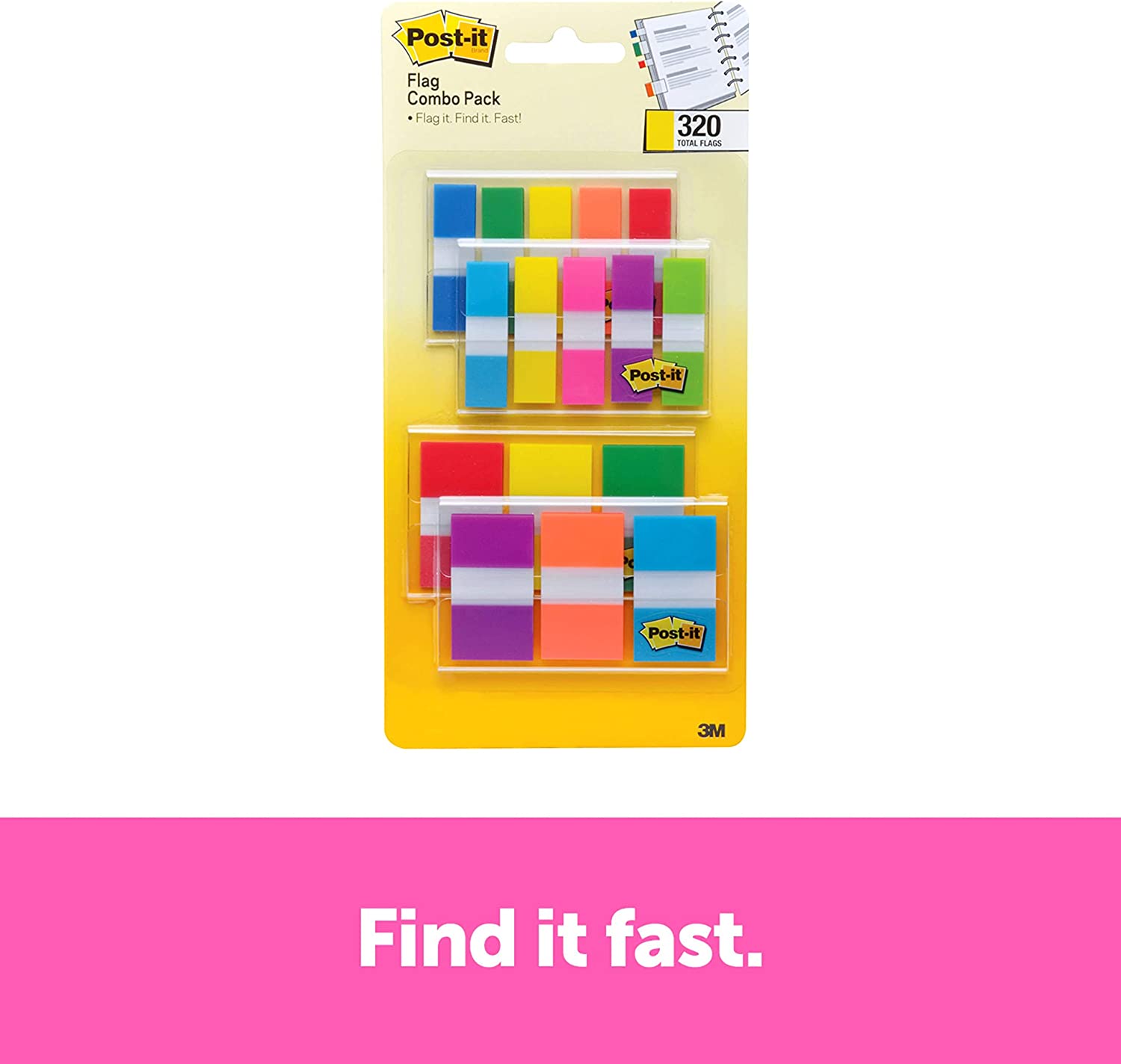 Find it fast with Post-it Flags in bright eye-catching colors that get noticed. They make it simple to mark or highlight important information in textbooks, calendars, notebooks, planners and more. They stick securely, remove cleanly and come in a wide variety of colors. Draw attention to critical items or use them to index, file or color code your work, either at home, work or in the classroom. This pack contains 120 of .94 in./Dispenser, 200 of .47 in./Dispenser/Pack.