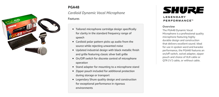 Shure PGA48 Dynamic Microphone - Handheld Mic for Vocals with Cardioid Pick-up Pattern, Discrete On/Off Switch, 3-pin XLR Connector, 15' XLR-to-XLR Cable, Stand Adapter and Zipper Pouch (PGA48-XLR)