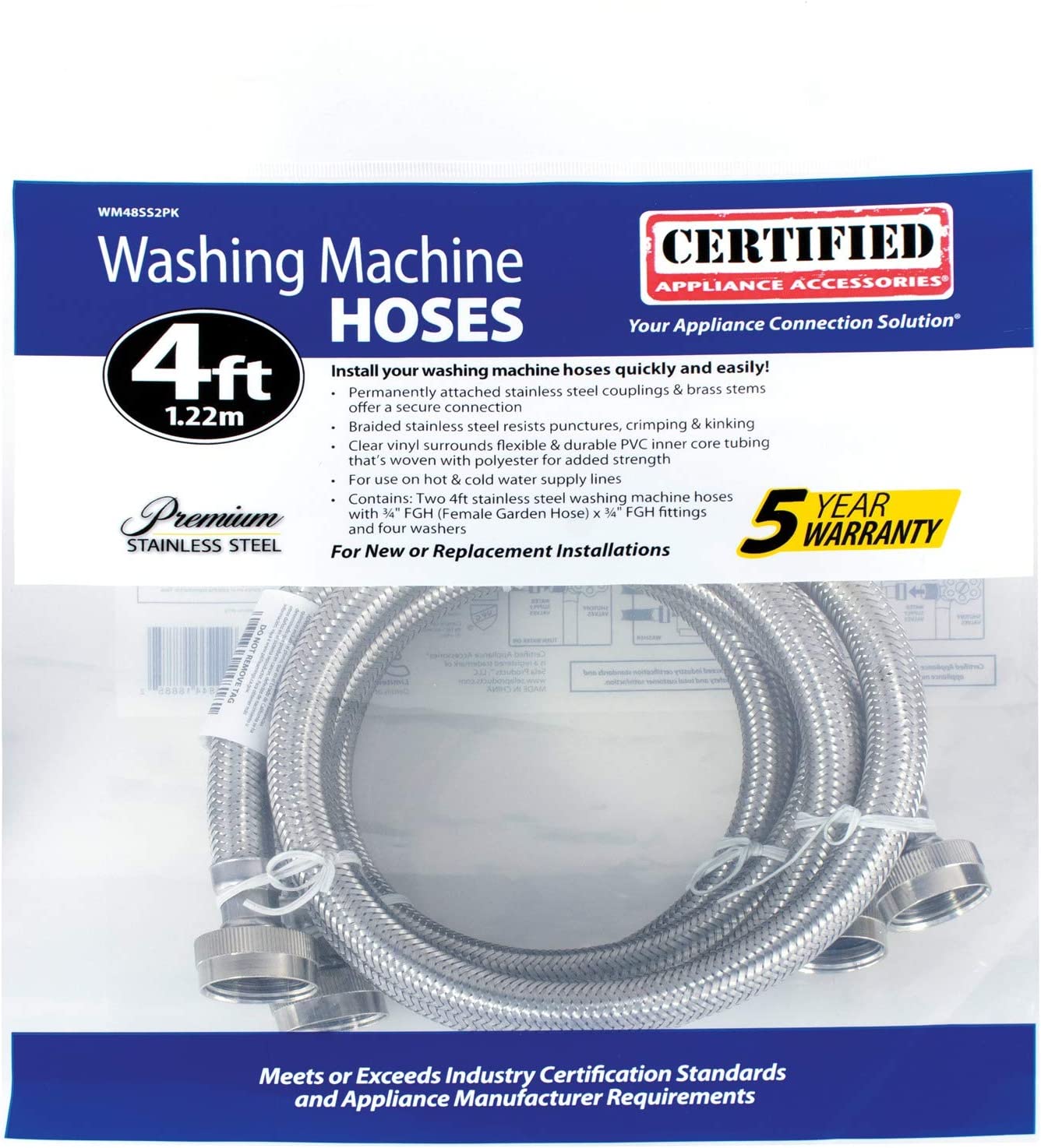 Certified Appliance Accessories Washing Machine Hoses (2 Pack), Hot and Cold Water Supply Lines, 4 Feet, PVC Core with Premium Braided Stainless Steel, Silver/Pewter, 161888