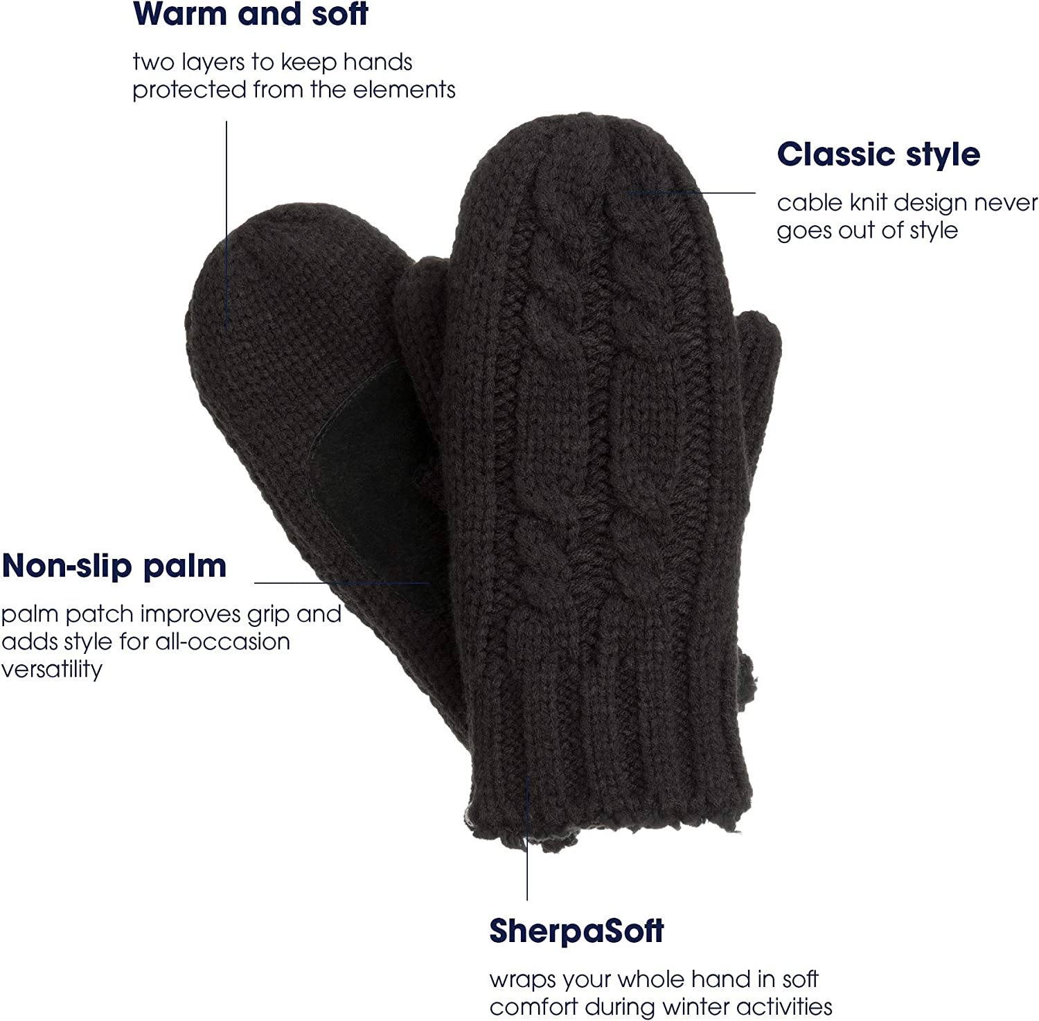• CLASSIC COMFORT: Classic cozy cable knit mittens for a timeless look that never goes out of style. Warm teddy soft fleece lining with non-slip palm patch improves grip and adds all-occasion versatility