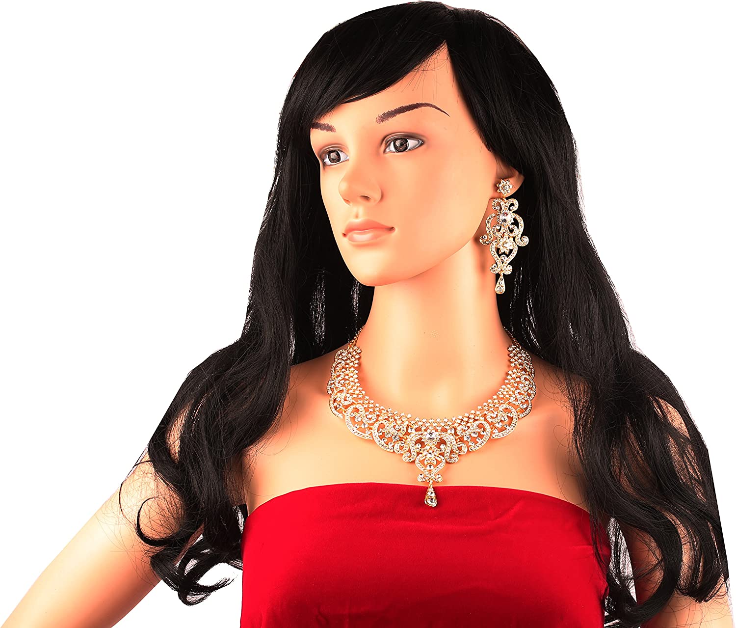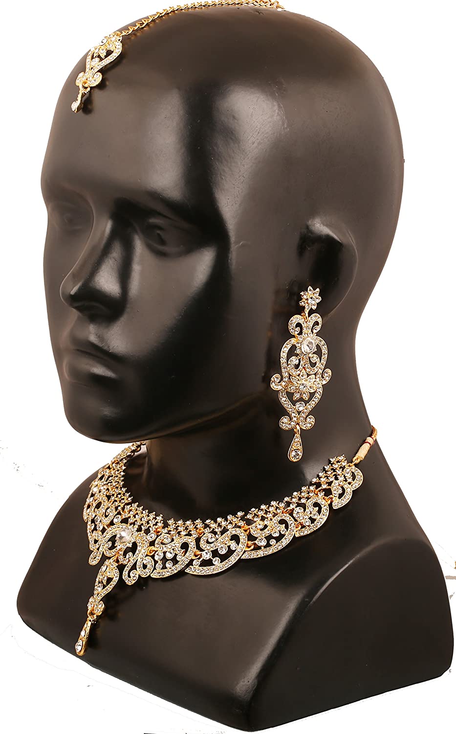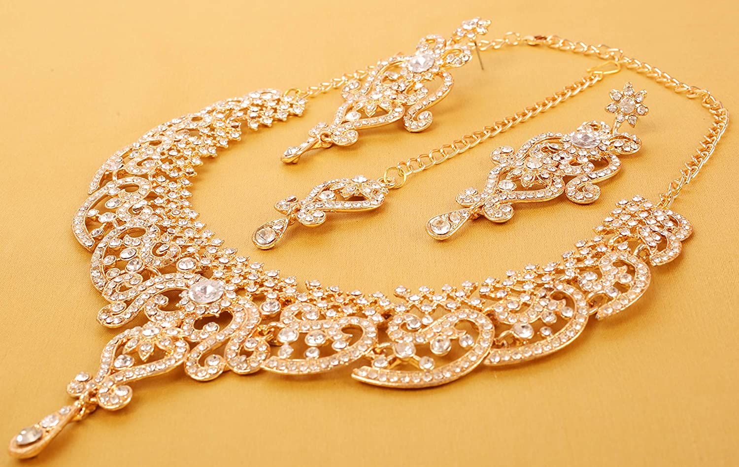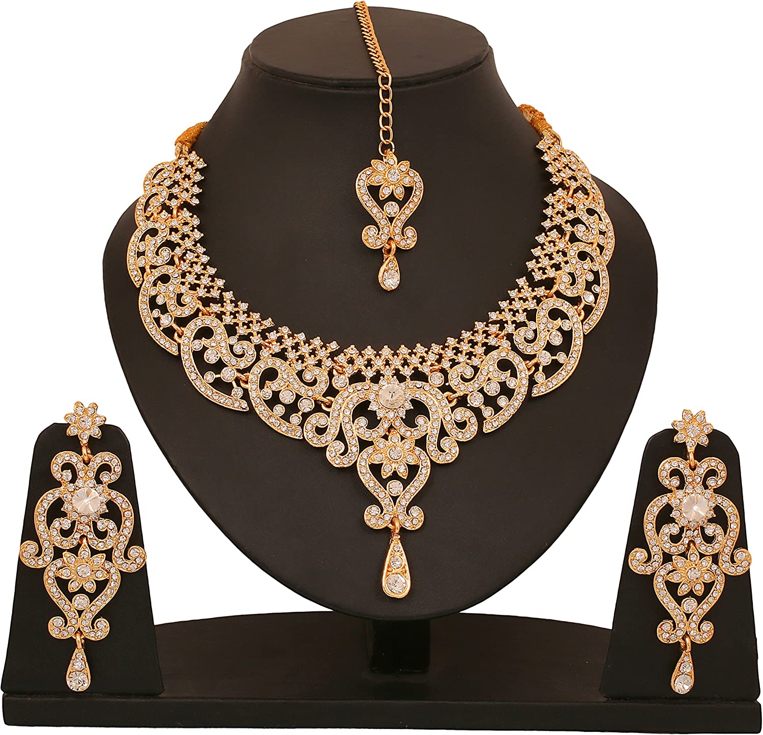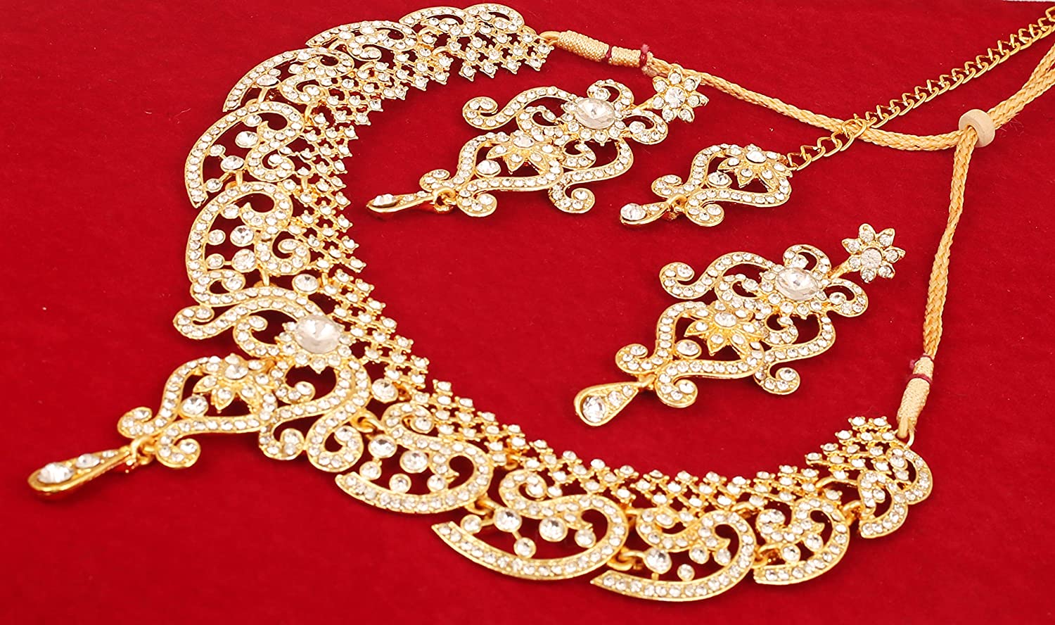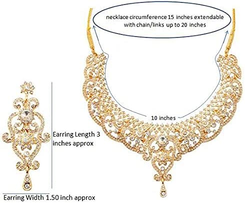 • Touchstone Indian Bollywood Choice Rich Traditional Exclusive Floral Workmanship Sparkling Rhinestone Designer Jewelry Grand ModernBridal Necklace Set With Mangtiak In Gold Tone For Women. EXTRA LONG EARRINGS. Length 3 inches SPECIFICATIONS : V shape necklace. Necklace circumference 18 inches. Earring weight (single) 18 gms. Earring length 3 inches . Earring width 1.25 inch.