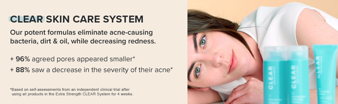 Paula's Choice CLEAR skin care line includes our Pore Normalizing Cleanser with Salicylic Acid, Daily Skin Clearing Treatment with Benzoyl Peroxide, Anti-Redness Exfoliating Solution with 2% Salicylic Acid (BHA), Ultra-Light Daily Hydrating Fluid with SPF 30+, and the Oil-Free Moisturizer.