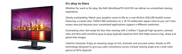 Enjoy widescreen performance, any way you want it. With a 24" 16:10 panel, IPS technology and LED backlight, the U2412HM provides a brilliant view, plus amazing adjustability to suit any style. Your monitor, your style. The ultimate in flexibility and customizability, the U2412HM monitor can be adjusted to suit your workspace, tailored to suit your viewing preferences, and with its wide viewing angle, it can be viewed from almost any position. Designed with the environment in mind. Your workspace isn't the only environment that can benefit from the U2412HM.