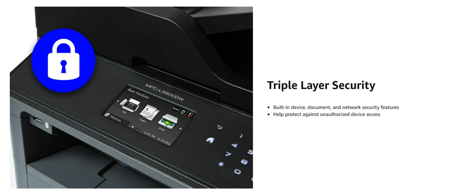 A perfect all-in-one office solution for small to medium-sized businesses, the Brother Business Laser MFC-L5800DW was engineered to help streamline office efficiency. With a print and copy speed of up to 42 pages per minute(2), this high-performance all-in-one produces professional-looking reports, spreadsheets, and other important documents with crystal-clear precision and accuracy. This Brother Business Laser All-in-One is a small office printer, copier, scanner, and fax machine that offers simultaneous operation (meaning that you can scan and print simultaneously). Also, a built-in automatic duplex printing function permits you to print on both sides of the paper, helping save money and resources. The MFCL5800DW multifunction printer offers multiple types of connectivity with Ethernet and wireless interfaces and mobile device printing and scanning support for most smartphones and tablets. (3) The easily navigated 3. 7-inch color touchscreen offers the option of creating up to 48 customized shortcuts for frequently used functions. Users can also scan to or print from popular business cloud services directly from the 3. 7-inch touchscreen display without using a computer via Evernote, Google Drive, Dropbox, and more. (1) This Brother all-in-one offers a 70-page capacity automatic document feeder for copying and scanning multi-page documents. The adjustable 250-sheet capacity paper tray and 50-sheet capacity multipurpose tray make printing and copying simple. This printer can be upgraded to a 1, 340-sheet total capacity with optional trays. The MFC-L5800DW is also Dash Replenishment enabled. This system allows the printer to measure the toner level of your Genuine Brother Replacement Cartridges and automatically order replacements. This ensures you never run out of toner so that you can maintain the office efficiency you expect and require. (1)Requires an Internet connection and an account with desired service. (2)Based on one-sided printing. Change from default setting required. (3)Requires connection to a wireless network. (4)Approximate toner cartridge yield in accordance with ISO/IEC 19752 (letter/A4).