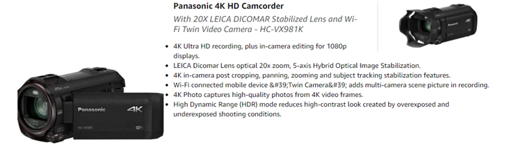 Panasonic 4K Ultra HD Video Camera Camcorder HC-VX981K, 20X Optical Zoom, 1/2.3-Inch BSI Sensor, HDR Capture, Wi-Fi Smartphone Multi Scene Video Capture (Black)