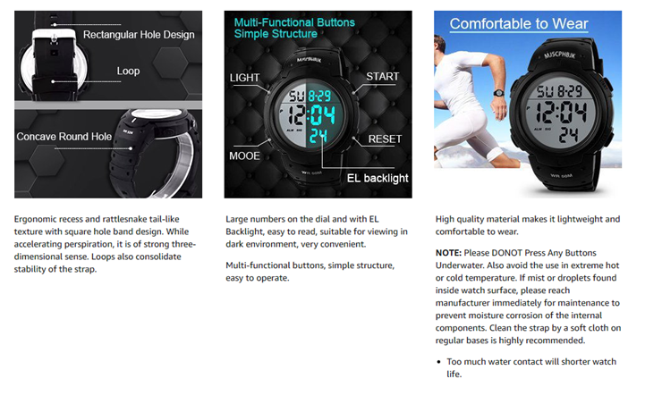 Thickened case to protect its internal parts. Anti-drop and not easy to be worn-out. Square concavesymmetry design, with the overall black color matching, it is of very cool sports style and personality.Specification:Dial Color: Black DialCase Diameter: 1.9 inch / 4.7 cmDial Case Thickness: 0.5 inch / 1.2 cmBand Color: BlackBand width: 0.8 / 2.1 cmBand Length: 9.8 inch / 25 cm(Suitable for 6.7-8.5 inch in circumference wrists to wear)Band Clasp Type: BuckleWatch Weight: 2.4 oz / 68 gBattery Code: CR2025Screw locked back cover, highly waterproof, easy to replace the battery.164FT 50M WATERPROOF, SWIM, SHOWER, NO PROBLEM! DESIGN for SPORT. 50M 5ATM water resistant.NOTE: please DO NOT press any buttons in the water. Military 24H time mode and imported EL back light functions make it perfect for all kind of sport and daily use.Material: Case Material: Silicon Rubber, Plastic Band Material: Silicon Rubber Mirror Surface: Mineral Glass MirrorErgonomic recess and rattlesnake tail-like texture with square hole band design. While accelerating perspiration,it is of strong three-dimensional sense. Loops also consolidate stability of the strapLarge numbers on the dial and with EL Backlight, easy to read, suitable for viewing in dark environment, very convenient.Multi-functional buttons, simple structure, easy to operate.High quality material makes it lightweight and comfortable to wear.