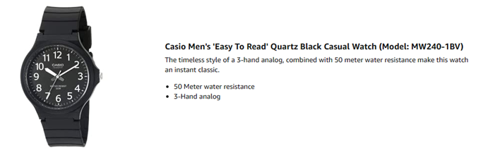 Resin Glass, 50-meter water resistance, Case / bezel material: Resin, Resin Band, Analog: 3 hands (hour, minute, second), Approx. battery life: 3 years on SR626SW, Total weight: 35 g