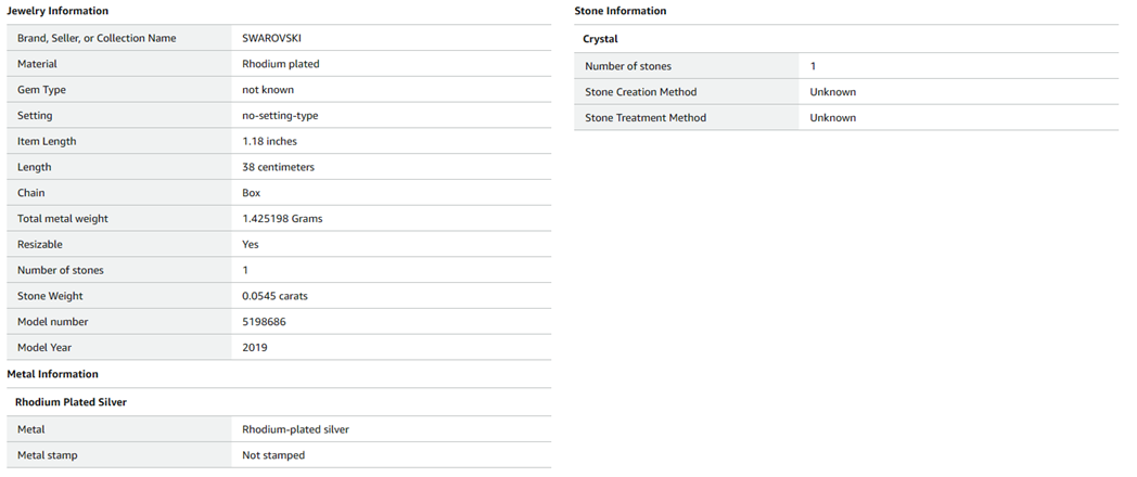 • Items delivered: 1 x Swarovski Creativity Collection necklace, 14 7/8 inch rhodium plated metal chain, 5/8 x 3/4 inch rhodium plated, white crystal circular design pendant, with Swarovski necklace box