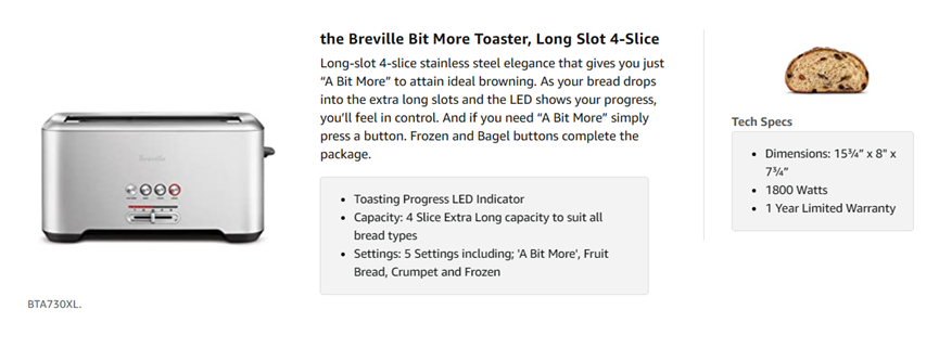 - The Breville Bit More is a long 4-slice toaster with an LED that allows you to monitor your progress; If you feel you need 'A Bit More' simply press a button to add a little extra time to the toasting cycle or check on your toast with "Lift & Look"