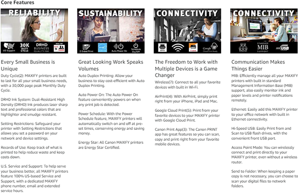 1. Document print speeds are the averages of ESAT in Office Category Test for the default simplex mode, ISO/IEC 24734. Document print speeds are the averages of FPOT in Office Category Test for the default simplex mode, ISO/IEC17629:2014. Print speed may vary. During successive printing, the printer may slow down the operation to prevent the internal temperature from rising. depending on system configuration, interface, software, document complexity, print mode, page coverage, type of paper used etc. Copy speeds are the average of sFCOT and sESAT, ISO/IEC 29183. Copy speed may vary depending on document complexity, copy mode, page coverage, type of paper used etc. and does not take into account warming up time. When scanning or copying a certain volume of documents (approx. 150 sheets in default settings) continuously from the ADF,the printer may switch to 'waiting mode' in which paper feeding stops for several tens of seconds after each scan to prohibit overheating the ADF. See usa.canon.com/ipm for additional details. 2. Duty Cycle is defined as the maximum number of printed pages for a single peak month. 3. Requires an Internet connection and the Canon PRINT Inkjet/SELPHY app, available for free on the App Store and at Google Play. Compatible with iPad, iPhone 3GS or later, and iPod touch 3rd generation or later devices running iOS 7.0 or later, and Android mobile devices running Android 2.3.3 or later. Your device must be connected to the same working network with wireless 802.11 b/g/n capability as your printer. For users of compatible Apple mobile devices, document printing requires Apple AirPrint, which requires an AirPrint-enabled printer connected to the same network as your iOS device. A printer connected to the USB port of your Mac, PC, AirPort Base station, or Time Capsule is not supported. 4. AirPrint functionality requires an iPad, iPhone 3GS or later, or iPod touch 3rd generation or later device running iOS 4.2 or later, and an AirPrint-enabled printer connected to the same network as your iOS device. A printer connected to the USB port of your Mac, PC, AirPort Base station, or Time Capsule is not supported. 5. Requires an Internet connection and Google account. Subject to Google Terms of Service. Certain exceptions may apply. 6. Requires Android mobile device with Android 4.4 operating system or later with the Mopria Print Service pre-loaded with that device and the compatible PIXMA/MAXIFY printer on the same wireless network. The Mopria experience is also available on Android 4.4 mobile devices with a download of the Mopria Print Service from Google Play. | 7. Wireless printing requires a working network with wireless 802.11b/g or n capability. Wireless performance may vary based on terrain and distance between the printer and wireless network clients. 8. Resolution may vary based on printer driver setting. Color ink droplets can be placed with a horizontal pitch of 1/600 inch at minimum. 9. Scan to Concur requires a valid Concur account. Scanned files have a 10MB volume limit, with a 100 page maximum. Multiscan not available, receipts uploaded to Concur Cloud. 10. ADF scan speeds are the average of scESAT30secA in 'ADF Productivity Measurement' test, ISO/IEC 17991:2015. Scan to network folder speeds with ADF are the average of scEFTP30secF in 'Scan to Network Folder Productivity Measurement' test, ISO/IEC 17991:2015. ADF scan speeds/Scan to network folder speeds with ADF will vary depending on system configuration, interface, software, document complexity etc. When scanning or copying a certain volume of documents (Approx. 150 sheets in default settings) continuously from the ADF, the printer may switch to 'waiting mode' in which paper feeding stops for several tens of seconds after each scan to prohibit overheating the ADF. 11. Optical resolution is a measure of maximum hardware sampling resolution, based on ISO 14473 standard. 12. The Public Switched Telephone Network currently supports fax modem speeds of 28.8 Kbps or lower, depending on telephone line conditions. Sending and receiving fax machines need to conform to ITU-T v.34 guidelines. 13. Black and white document fax transmission speed is based on default setting using ITU-T No.1 chart. Color document fax transmission speed is based on default setting using Canon Color Fax Test Sheet. Actual transmission speed varies depending on document complexity, fax setting at receiving end, and line conditions etc. 14. Page count is based on ITU-T No.1 chart or Canon FAX Standard Chart No.1. The number of pages able to be kept in memory will vary based on remaining memory capacity and document complexity. 15. High Page Yield calculated when using Canon Genuine XL Ink Tanks. 16. Requires an Internet connection. 17. Acoustic Noise is measured based on ISO7779 standard. 18. Operation can only be guaranteed on a PC with factory-installed Windows 10, Windows 8.1, Windows 8, Windows 7, Windows Vista or XP. | 19. Available from printer driver and fax driver only. XPS drive is not supported for Windows Server 2003 and 2003 R2. 20. Internet Connection required during software installation. 21. Some functions may not be available with these Operating Systems. Please refer to the manual or our website for full details. 22. Requires a Windows RT compatible device with Windows 10, Windows 8.1 or Windows 8 and the Canon Easy-PhotoPrint app for Windows RT available for free in the Windows Store. 23. PosterArtist Lite software v2.60.00 is compatible with 64/32 bit versions of Microsoft Windows10, Windows 8.1, Windows 8, Windows 7 and Windows Vista, and only compatible with Canon PIXMA (released after July 2015), MAXIFY, imagePROGRAF and Océ printers. Minimum computer system requirements: Pentium4 2.4Ghz CPU or higher with 1GB RAM, 1024x768 pixel display and 5GB of system hard drive space. 24. Warranty programs are subject to certain conditions and restrictions. See the official website for details. 25. Dimensions with letter (A4) paper i