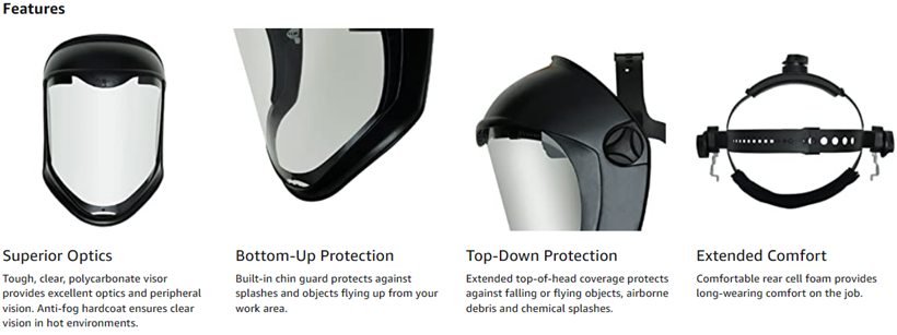 • Full shield design provides built-in chin protection and extended top-of-head coverage; protects against falling or flying objects, impacts, chemical splashes and airborne debris; black matte color