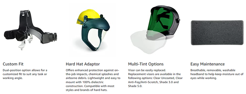 • Easy-to-set, ratcheting headgear assures comfortable, secure fit; highly adjustable headgear tilts visor nearer or farther from face for preference and application; 2,784 total possible positions