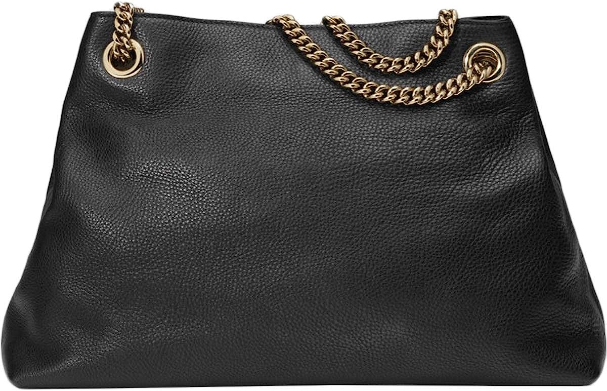 • This Gucci black leather bag features the interlocking GG logo. It is large enough to carry all of your essentials in style. The shoulder straps are made of gold chain, but come with leather shoulder padding for comfort. This designer handbag goes great with everyday looks and is super classy.