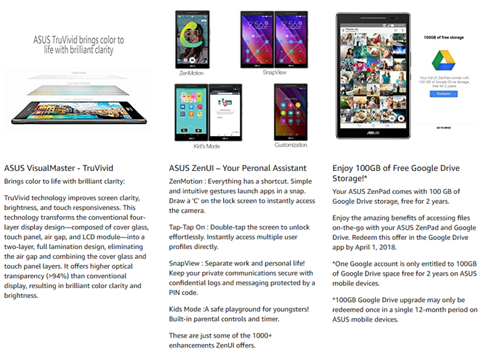 ASUS ZenPad 10 delivers exceptional performance with Quad-core processor, 2GB memory and 16GB on board storage. It also has any-way-up USB-C, rapid fingerprint security, and high-capacity 4680mAh battery to keep the entertainment going.