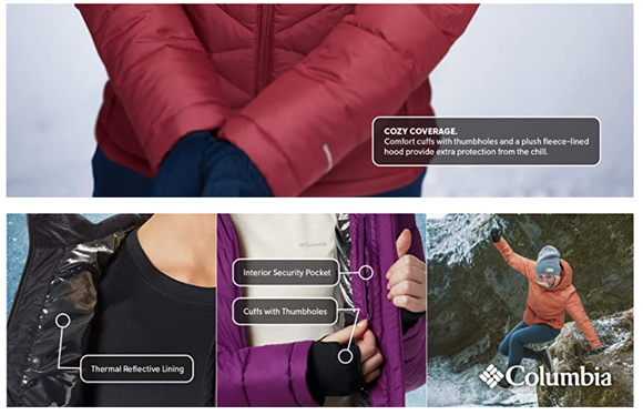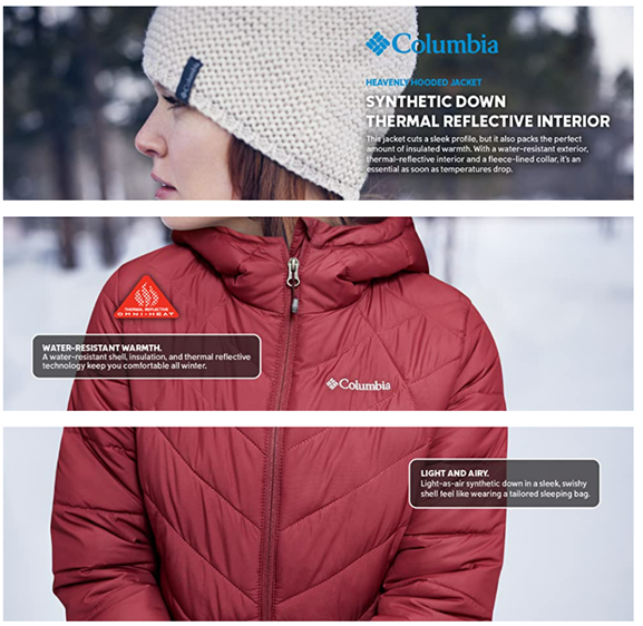 • Columbia Women's Heavenly Hooded Jacket features Omni-Heat Reflective technology, a 100% polyester synthetic down lining, and handy features to keep you cozy and protected during weather-heavy days.