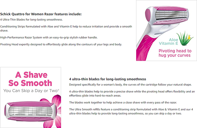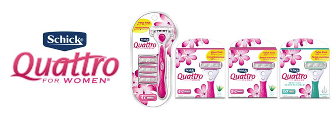 The Schick Quattro for Women Value Pack Razor now with 4 cartridges offers an incredibly close, silky smooth shave at a great value! With its pivoting, 4 ultra-thin blades, the razor provides flexibility and an effortless glide along the contours of your legs and body. The easy-to-grip rubber handle feels comfortable and balanced in your hand, while the conditioning strips formulated with Aloe & Vitamin E, help to reduce irritation - for a shave so smooth you can skip a day or two. Choose between Schick Quattro for Women Ultra Smooth or Sensitive blade refills for long-lasting, smoothness. All Schick Quattro for Women Refills can be used with any Schick Quattro for Women Razor.