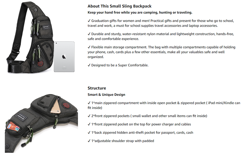 • ✅【Unbalance backpack wearing styles】It has great flexibility. You can use it both as chest pack and shoulder bag. Also it can be worn in the front or back of body.