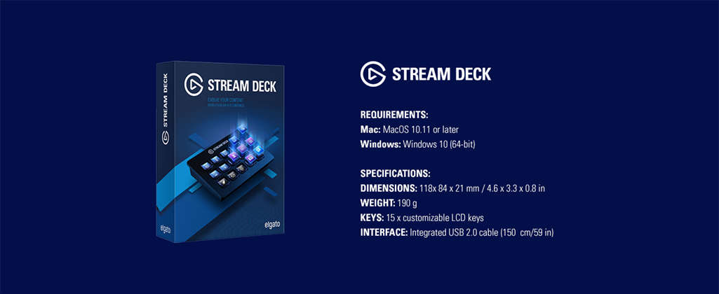 Stream Deck puts 15 LCD keys at your fingertips for ultimate studio control. Simply tap to switch scenes, launch media, tweet your feats and more. Personalize your keys with custom icons or choose from hundreds, and get visual feedback every time you execute a command. With Stream Deck, maximize your production value and focus on what matters most: Your audience. Interface Integrated USB 2.0 cable.