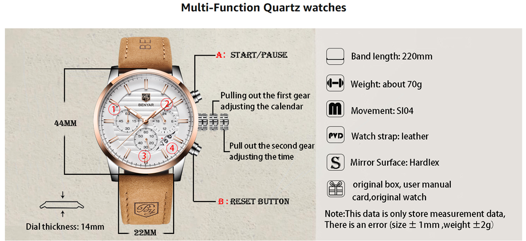 • FULL FUNCTIONAL CHRONOGRAPH AND WATERPROOF: Three Chronograph Sub-dial, Seconds sub-dial, Minute Sub-dial, 24 hour Sub-dial. Waterproof (30 M) - 3ATM. Perfect for all kind of business, casual, indoor and outdoor activities and daily use,but not suitable for swimming, bathing and sauna.
