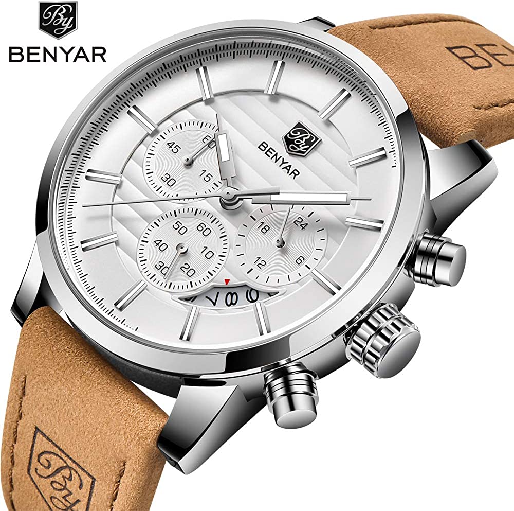 BENYAR Quartz Chronograph Waterproof Watches Business and Sport Design Leather Band Strap Wrist Watch for Men