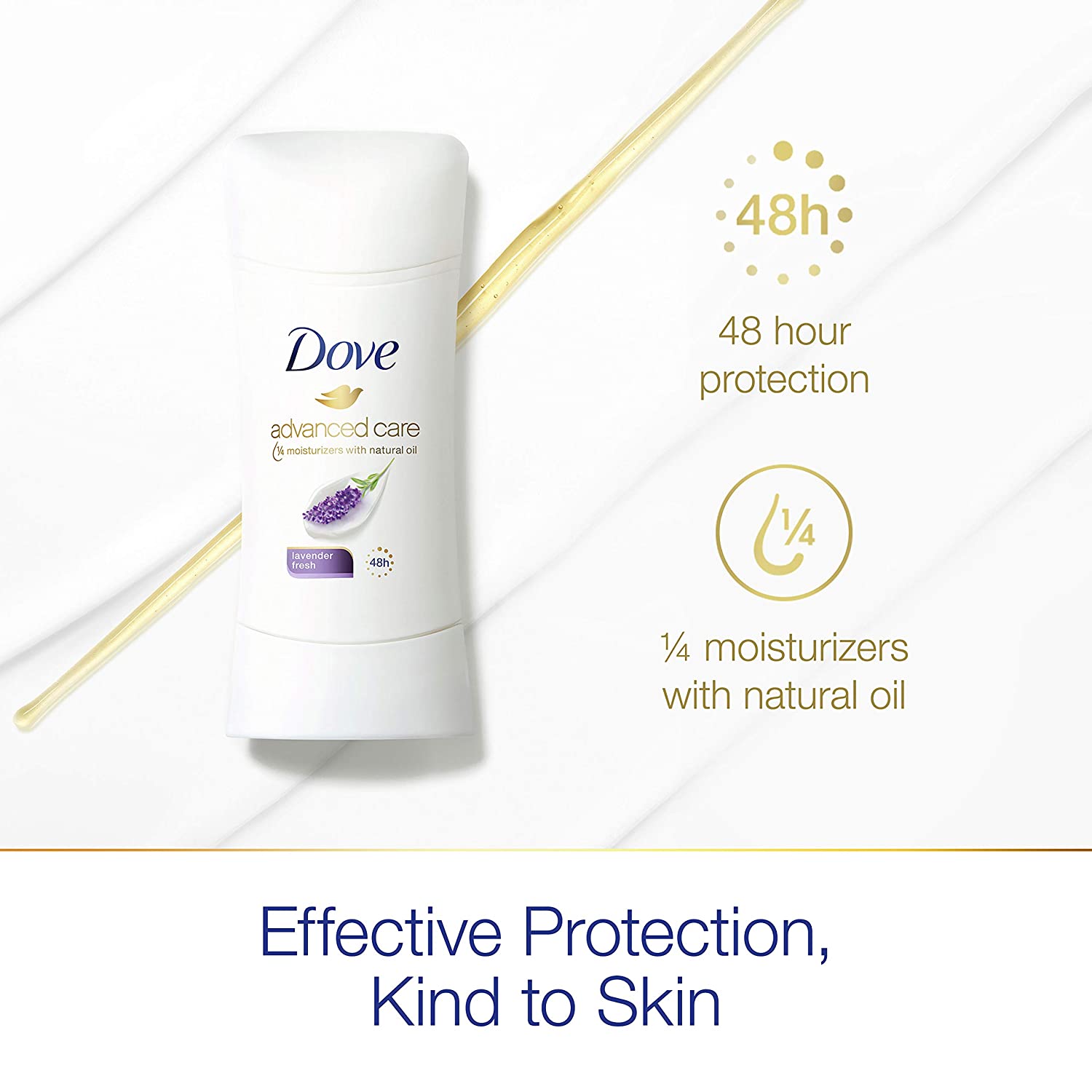 Long-lasting antiperspirant protection, gentle skin care, and a fresh, lavender scent – who says you can’t have it all? Start your day with Dove Advanced Care Lavender Fresh Antiperspirant deodorant.Stick. Enriched with our signature 1/4 moisturizers with natural oil, this antiperspirant stick leaves you with soft, comfortable underarms. Made with a kind-to-skin formula and containing 0 percent alcohol (ethanol), it helps delicate skin recover from underarm irritation caused by shaving. Use this antiperspirant deodorant.regularly to enjoy comfortable and healthy-feeling underarms. Keeping you fresh all day, this gentle antiperspirant for women protects from sweat and odor for up to 48 hours. If you’ve been wondering how to get soft, comfortable underarms. choose our antiperspirant stick and enjoy beautifully fresh underarms.that stay dry all day long. For best results, apply this Dove antiperspirant deodorant.to dry skin after showering and enjoy fresh, comfortably dry skin from morning to night. Dove is certified cruelty-free by PETA because we believe that real beauty is cruelty-free. We’re on a mission to help women raise their self-esteem – because we believe beauty should be a source of confidence, not anxiety. Dove Antiperspirant deodorant. deliver effective underarm protection and are kind to skin, so women can be free of underarm inhibitions and live beautifully unselfconsciously.