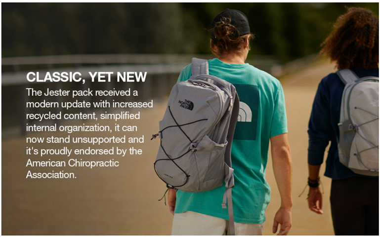 CAMPUS READY. Our much-loved Jester pack has received a modern update: we've increased recycled content, simplified internal organization and it can now stand unsupported. Oh, and it's proudly endorsed by the American Chiropractic Association.