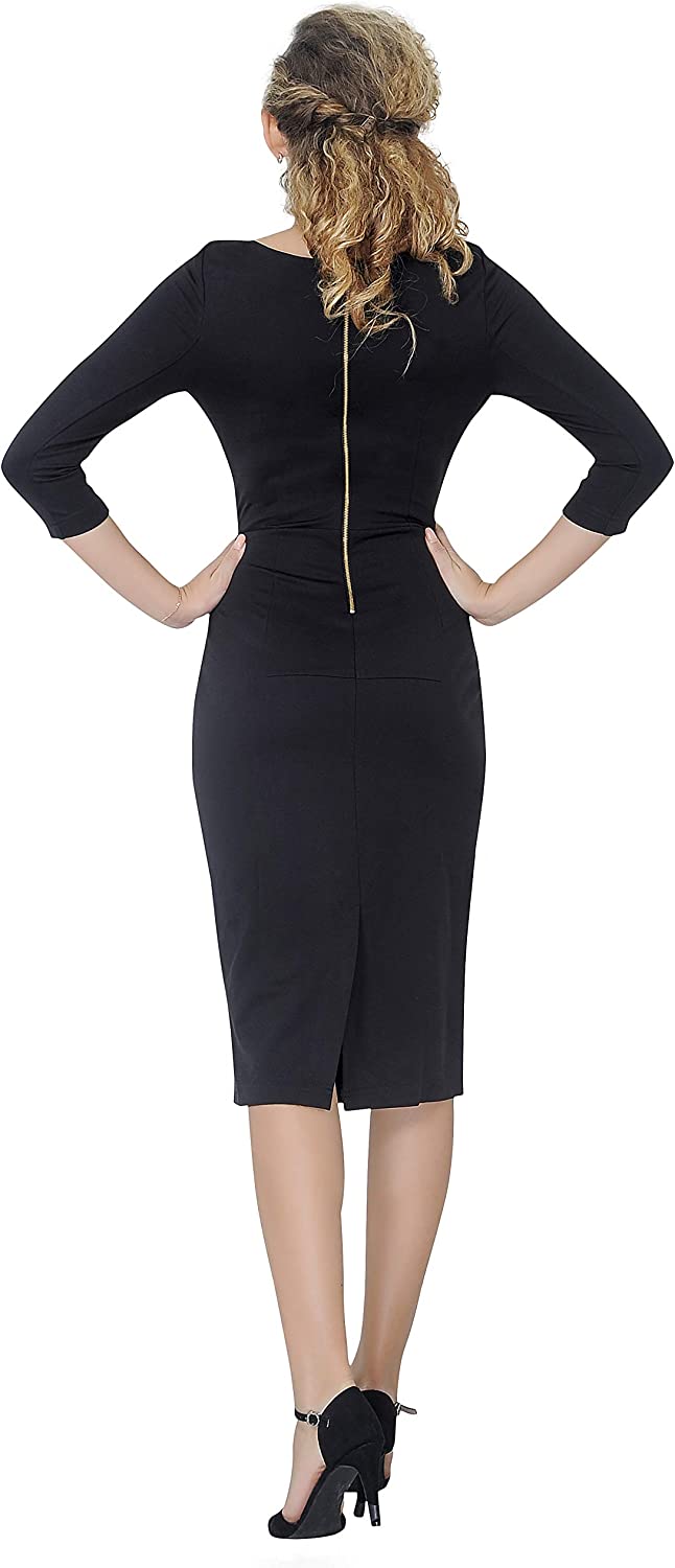 Made by Marycrafts, this dress, undoubtedly owns elegant and modest features to help you inner lights shine in every occasion FEATURES: - SQUARE SLIT NECK - 3/4 SLEEVES - PENCIL SILHOUETTE - COPPER BACK ZIPPER - MIDI LENGTH (43-45")