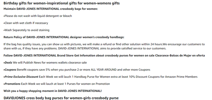 BRAND:DAVIDJONES purses for women designed in French since 1987.We are distributing Great stylish and versatile handbags for women in more than 100 countries .Excellent craftsmanship and refined premium quality leather like PU women purse.Decent quality women handbag with affordable price.
