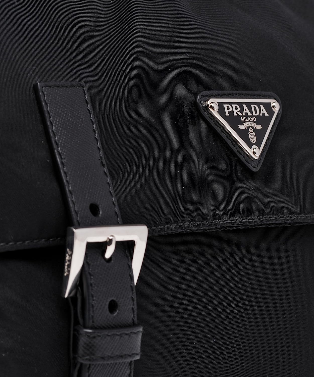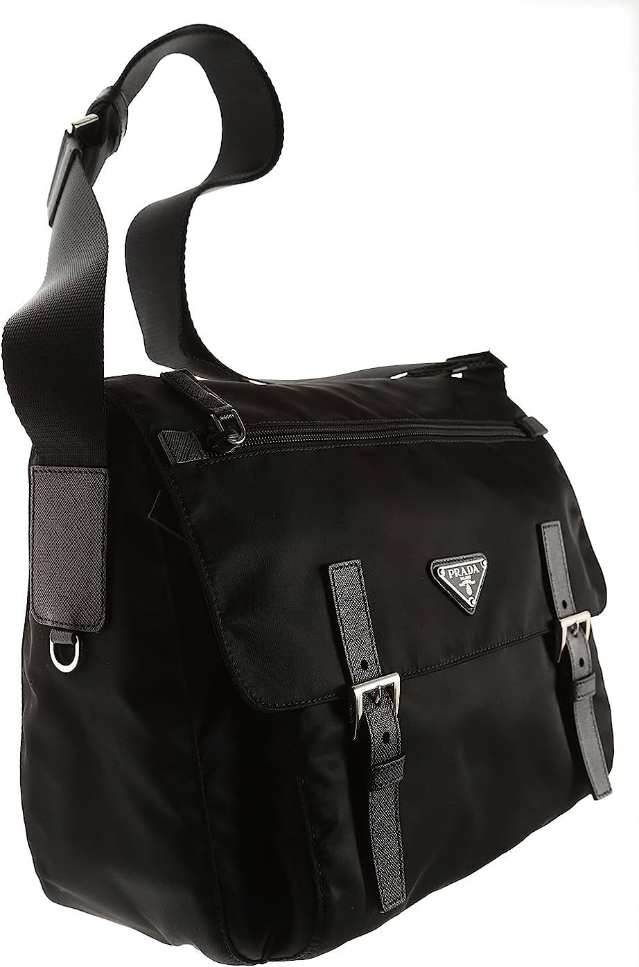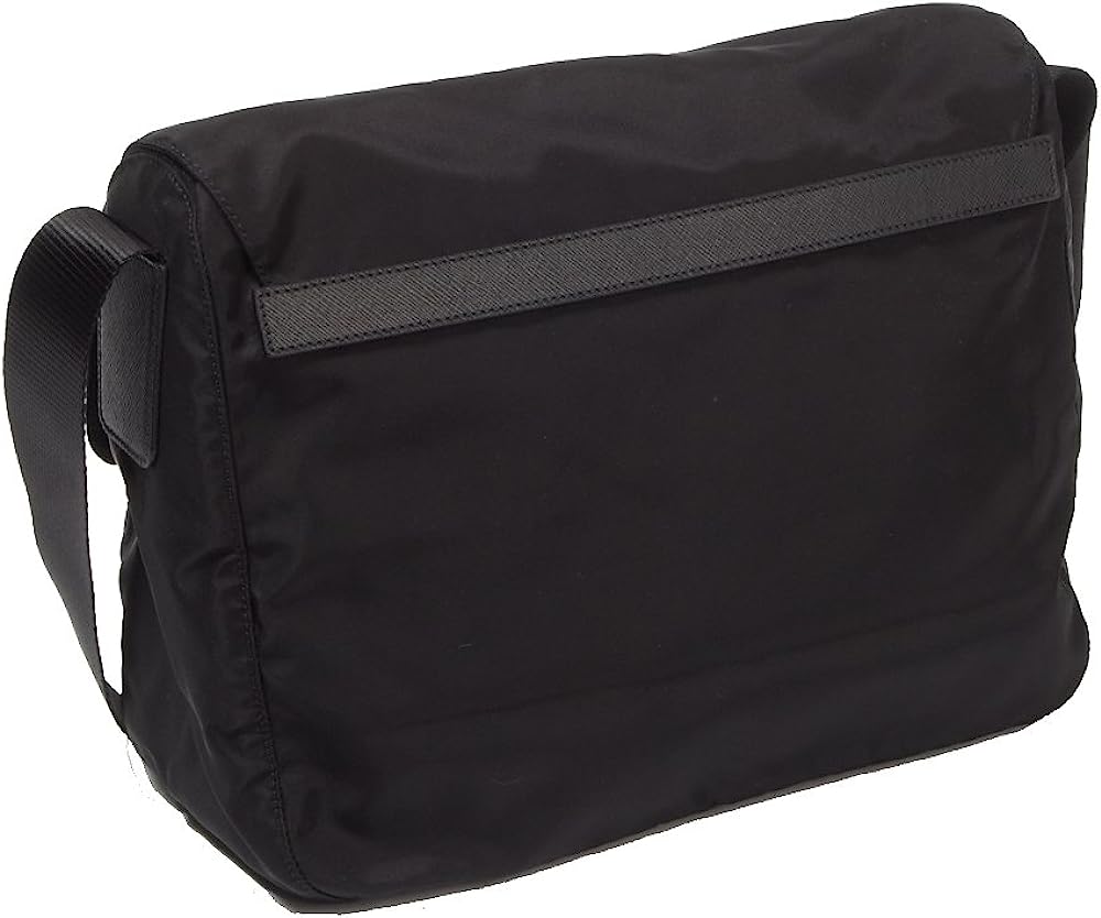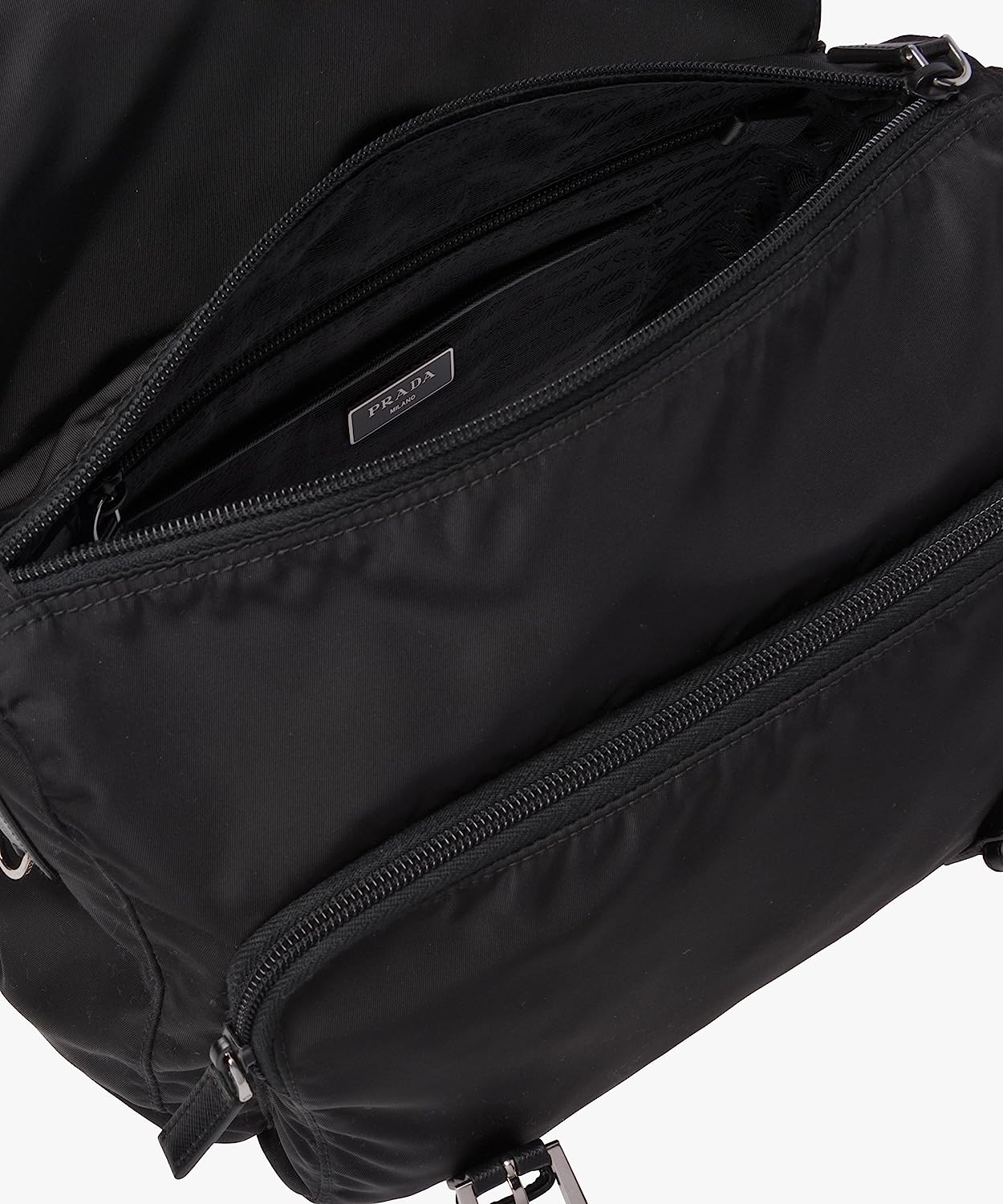 Black Tessuto nylon material Saffiano leather details Steel hardware Enamel triangle logo Zipper and buckle closure Two outside pockets, including one with zipper on the flap Two inside pockets, including one with zipper Adjustable fabric shoulder strap