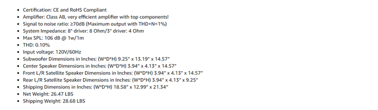 - Zero distortion can be heard even with volume and bass settings all the way up! The sound on this system is better than anything even that cost twice the price!. Cable Length: Front L/F: 12Ft, Rear L/R: 30Ft, Center: 10Ft. Frequency Response: 20Hz – 20KHz. Certification: CE and RoHS Compliant. Signal to noise ratio: ≥70dB (Maximum output with THD+N < 1%)