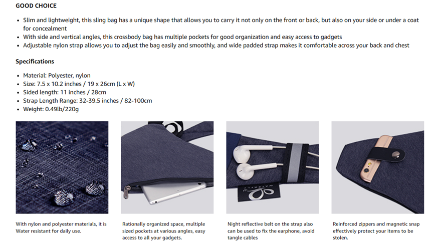 • Unique Design: There is a small pocket on the strap for cards storing and a reflective belt for easy seen in the dark; This sling bag is slim enough to concealed carry under your coat or suit