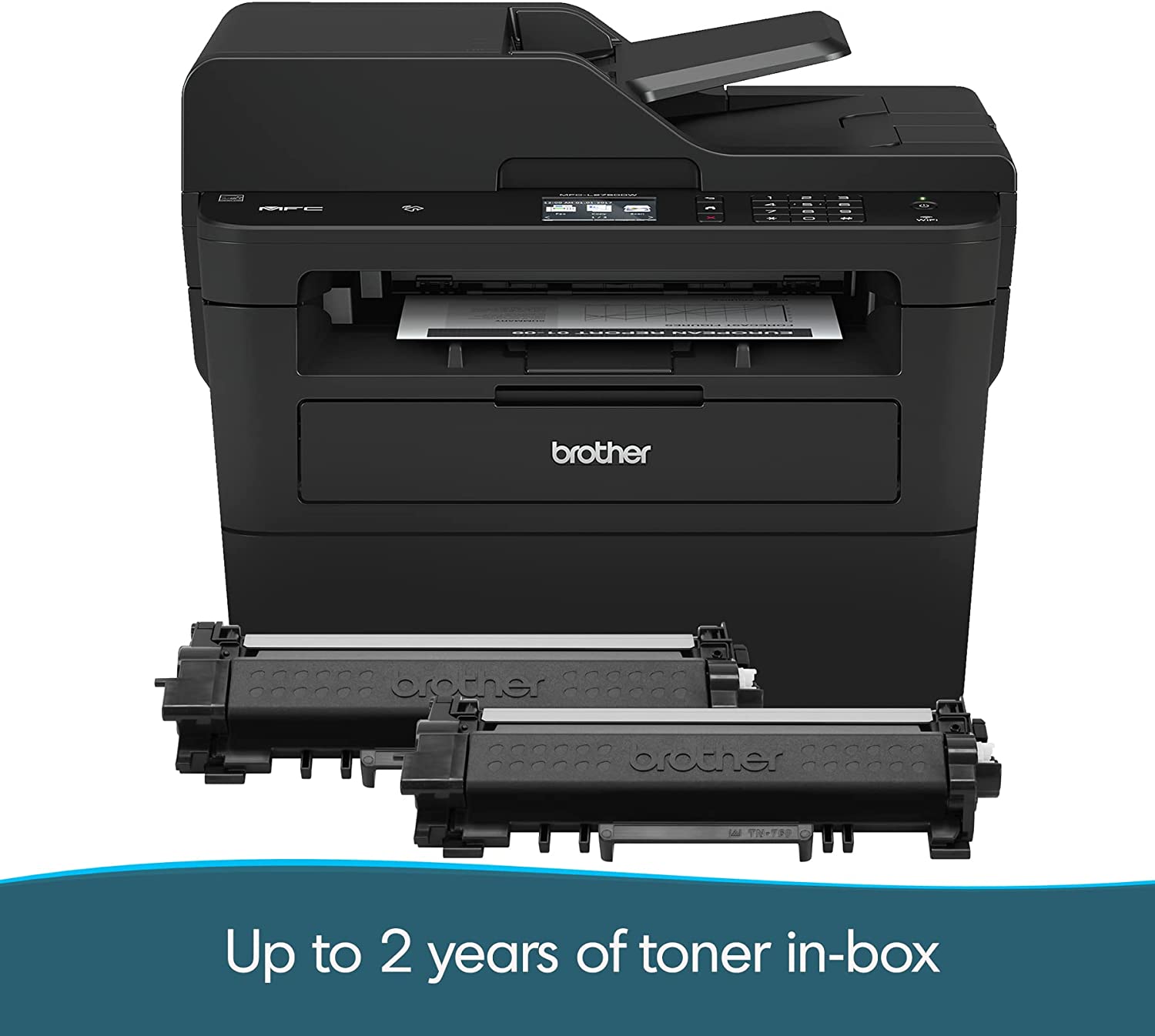 This new all-in-one laser printer also offers a “Touch to Connect” feature for printing and scanning with NFC, which increases convenience. Users can print-from and scan-to multiple cloud-based services, directly from the 2.7” color touchscreen, including Google Drive, Dropbox, Evernote, OneNote, and more. This all-in-one is designed with a 250-sheet paper tray that improves efficiency by requiring fewer refills. The MFC-L2750DW XL can handle letter- or legal-sized paper and prints with exceptional quality, regardless of the print size or font used. And we’ve added an up to two year supply of toner, including one high-yield and one super-high-yield cartridge. You can purchase replacement Brother Genuine high-yield toner (TN-760) or super high-yield toner (TN-770) conveniently on Amazon (also compatible with TN-730 replacement toner cartridge).