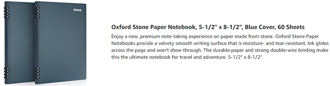 Enjoy a new, premium note-taking experience on paper made from stone. Oxford Stone Paper Notebooks provide a velvety smooth writing surface that is moisture- and tear-resistant. Ink glides across the page and won't show through. The durable paper and strong double-wire binding make this the ultimate notebook for travel and adventure. 5-1/2" x 8-1/2". 60 Sheets. Blue. 2 Pack.