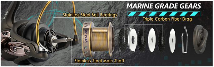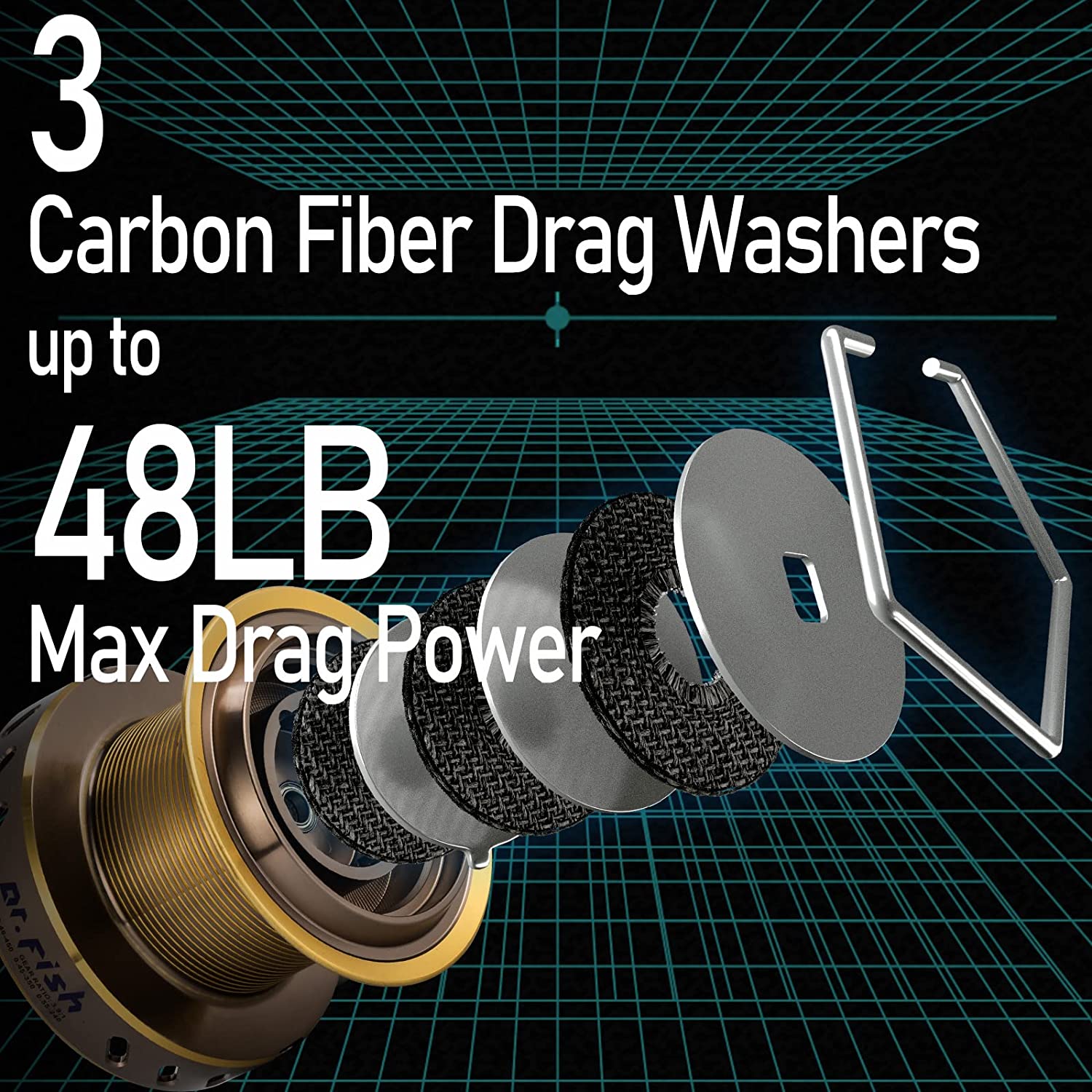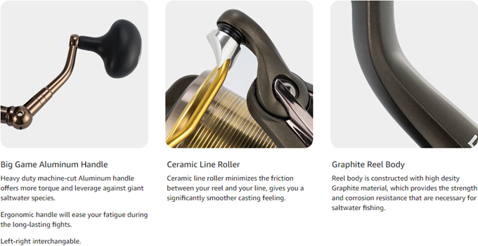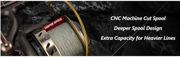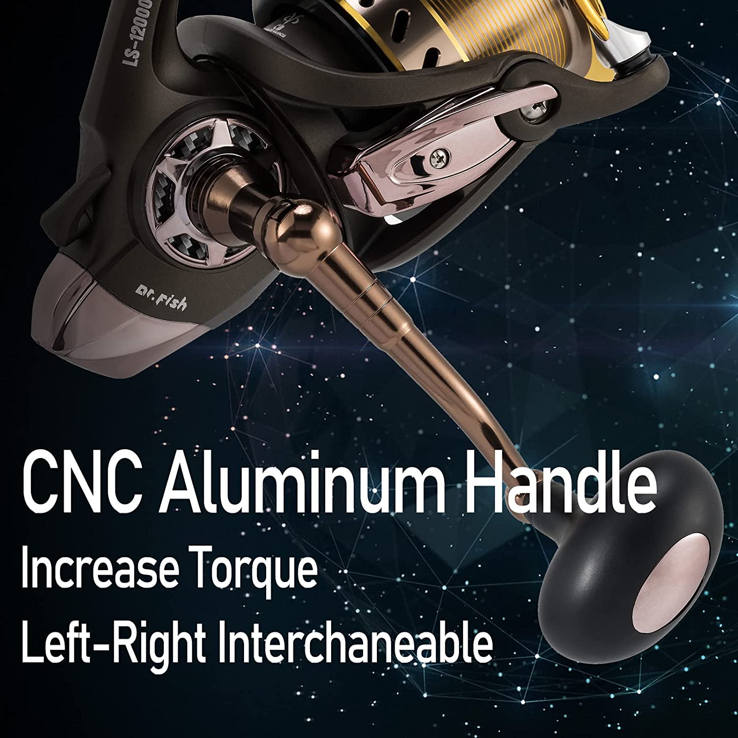 • HUGE CNC Aluminum spool allows you to easily put more and heavier lines on your reel for bigger fights, and help you cast longer and faster. Powerful Aluminum handle will help you dominant every battle.