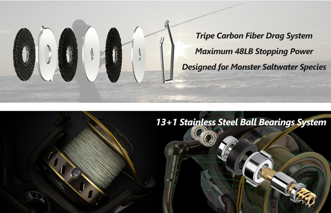 • BIG & STRONG! Unprecedented 48LB max drag(12000 model) will put you in the winning position when a big fish bites. 3.9:1 Rock-steady gear ratio provides more torque and gives you advantage when a big fight comes.