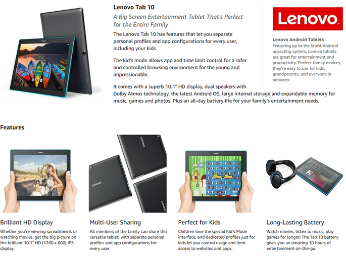 Entertainment is at your fingertips with the Lenovo Tab 10. Running on Android 6.0 Marshmallow, this 10.1" tablet boasts a 10-hour battery life and dual stereo speakers with Dolby Digital Plus audio. Stream movies, play music, explore apps and more through the tablet's 1280 x 800 resolution touchscreen