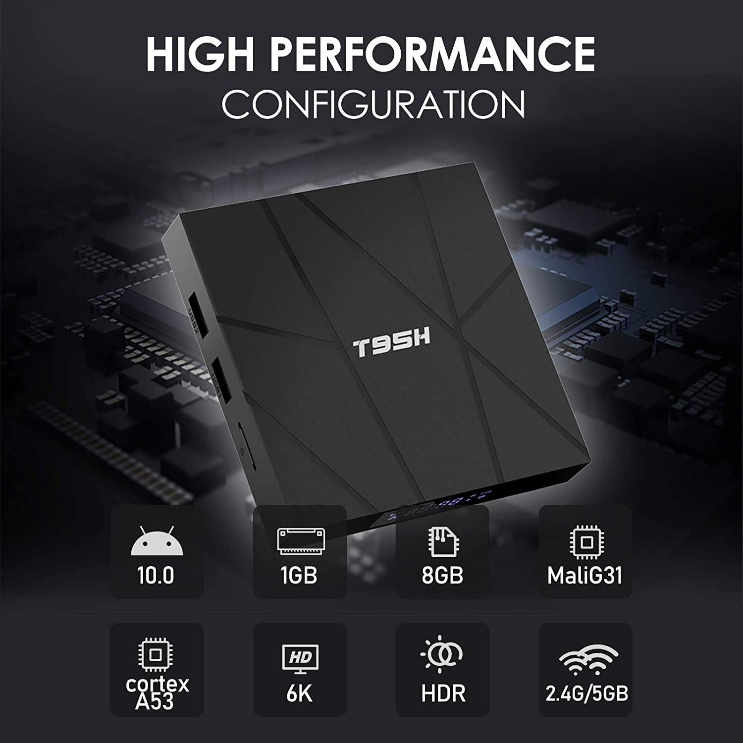 【Latest Android 10.0 OS 】T95H Smart TV Box comes with Android 10.0 OS update and H616 Quad-core G31 GPU processor, which is more efficient and faster than the Android 9.0 system. Android Box has better compatibility with massive Android software, games, and application programs, better user interface, and user experience.