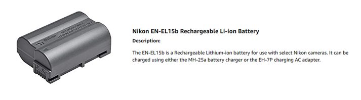 The Nikon EN-EL15b Rechargeable Li-ion Battery works as a spare or replacement for the existing battery that comes with the Nikon Z7 or Z6 mirrorless camera. It offers a long shooting time and doesn't develop memory effect during discharging. You can recharge the battery using optional MH-25 and MH-25a chargers.