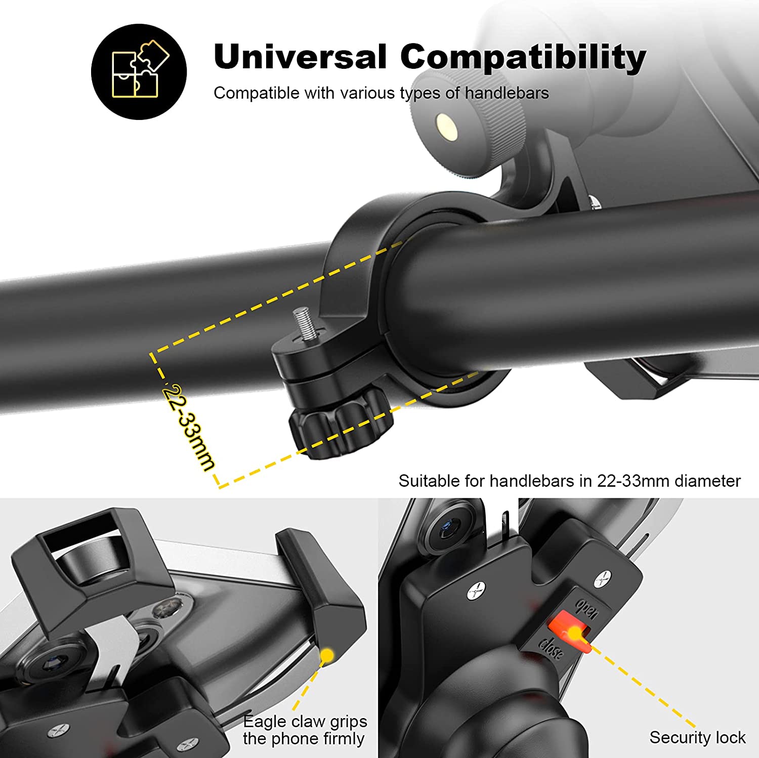 Convenience Upgrade:The Bike Phone Holder has Super durable and Hyper elasticity Clockwork to Automatic contraction clamp arms! One-switch to Lock or Unlock the Clockwork! Ensure safety and stability!