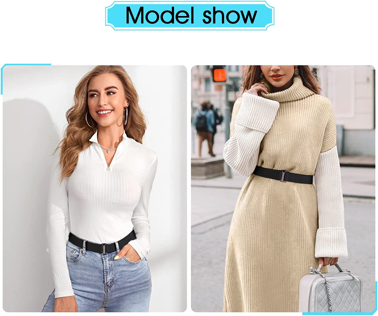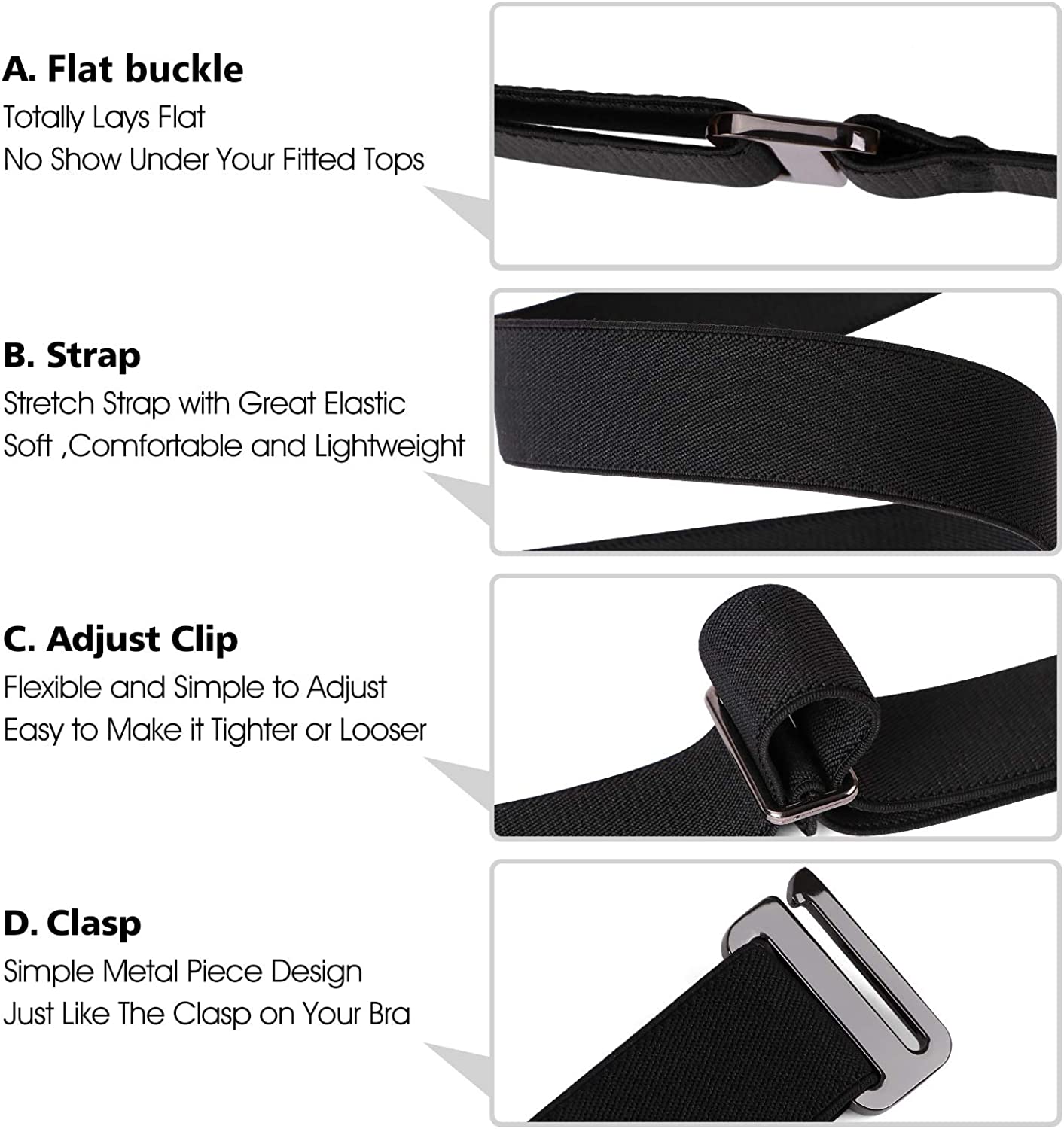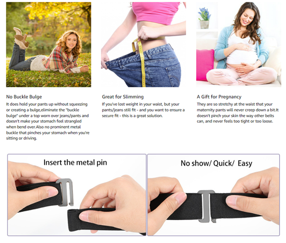 • ☘ Stretch Belt Strap--- Patent maintenance. This stretch women belt is soft ,comfortable and lightweight to wear.The high quality strap is flexible to adjust with great elastic,not easy to fray with heat sealed belt end.Never slide on the elastic web but not on a smooth plastic strap.